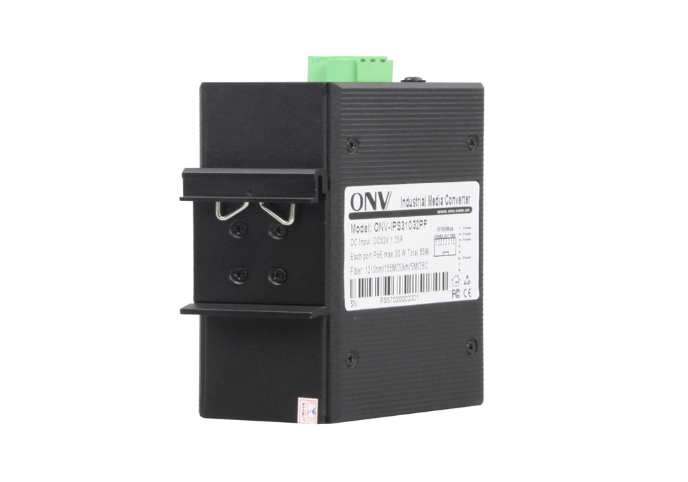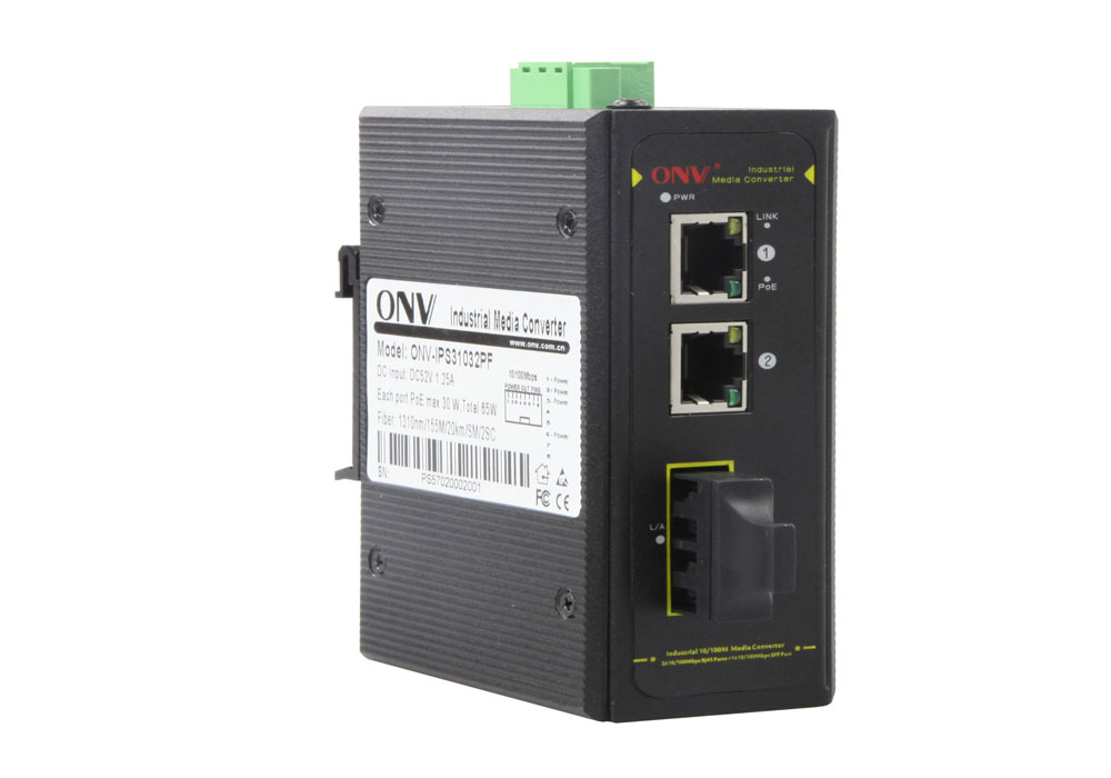 3-port 10/100M Industrial PoE Switch with 2x10/100M Ethernet PoE ports + 1x 100M multimode dual fiber SC optical port.