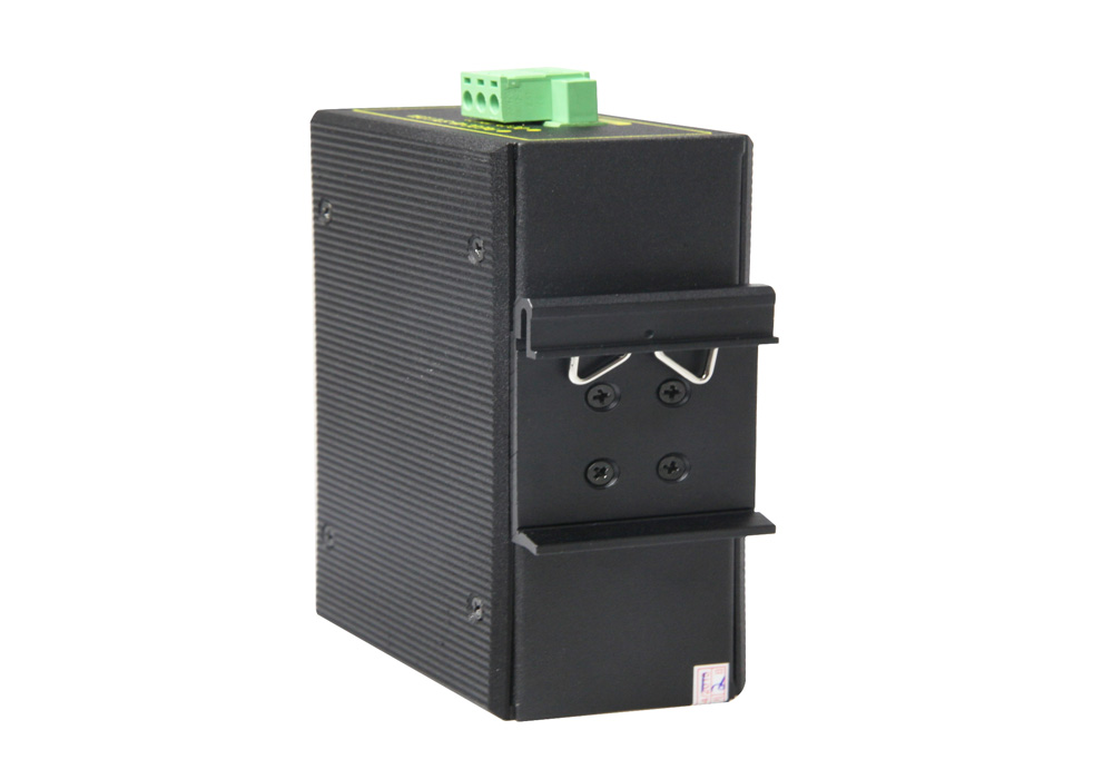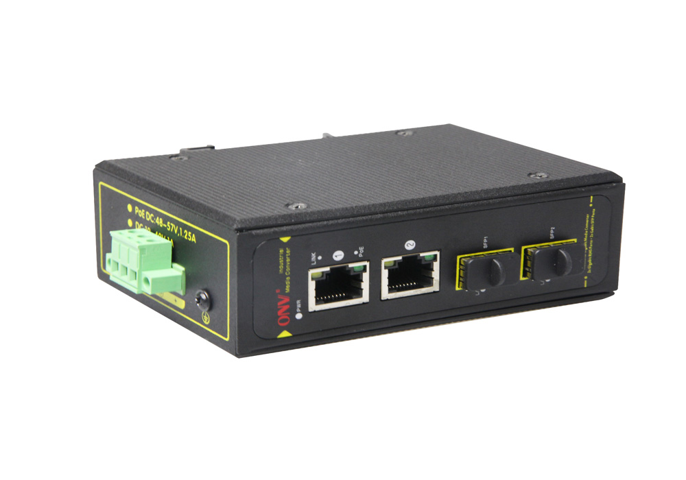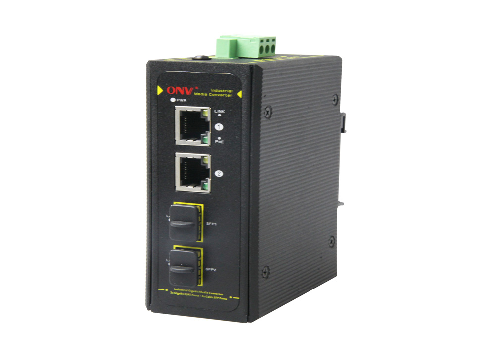 10/100/1000M 4-port Industrial Ethernet Media Converter with 2 gigabit RJ45 ports and 2 gigabit SFP slots.